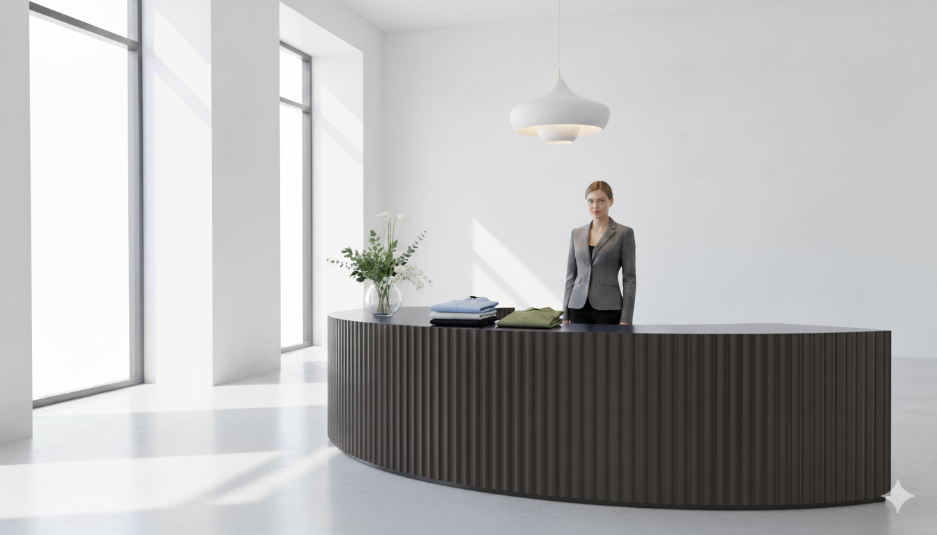 Podium Ronda reimagines the act of reception as an architectural gesture - continuous, rounded, and alive with movement. Its soft, flowing form invites approach from every angle, turning functionality into presence. Crafted through robotic precision and shaped by digital design, Ronda is more than a desk; it’s a sculptural welcome that defines the rhythm of space.